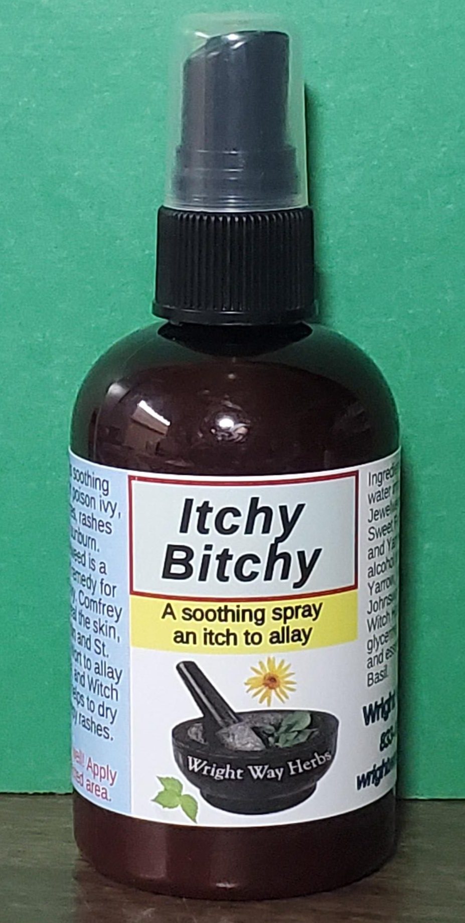 INGREDIENTS: Yarrow, Sweet fern, Jewelweed, St. Johnswort, Comfrey, Plantain and Grindelia; Basil essential oil, Witch Hazel, pure grain alcohol and distilled water.