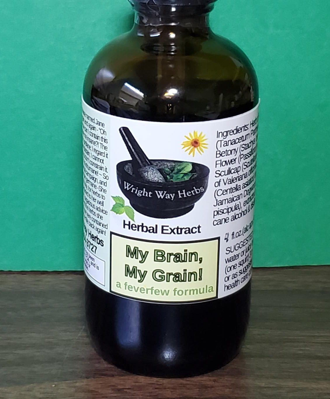 INGREDIENTS: herb of Feverfew (Tanacetum parthenium), Wood Betony (Stachys betonica), Passion Flower (Passiflora incarnata), Scullcap (Scutellaria laterifolia), Blue vervain (Verbena hastata), root of Valerian officinalis, Jamaican dogwood (Piscidia piscipula); extracted in organic cane alcohol and distilled water.